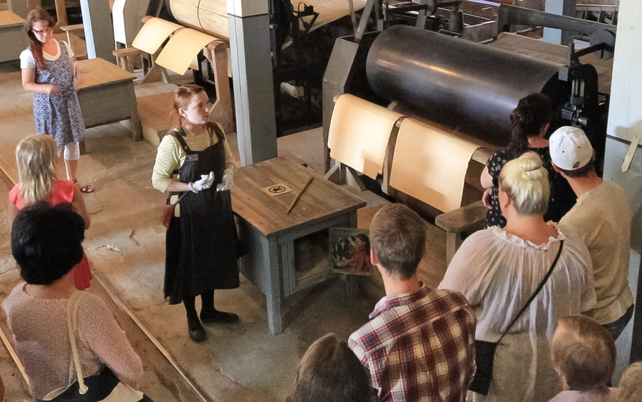 The Verla Mill Museum, consisting of the groundwood and board mill, can be visited only as part of a guided tour. Tour guides bring the museum to life with stories about the mill. The museum offers tours in various languages for international guests.
