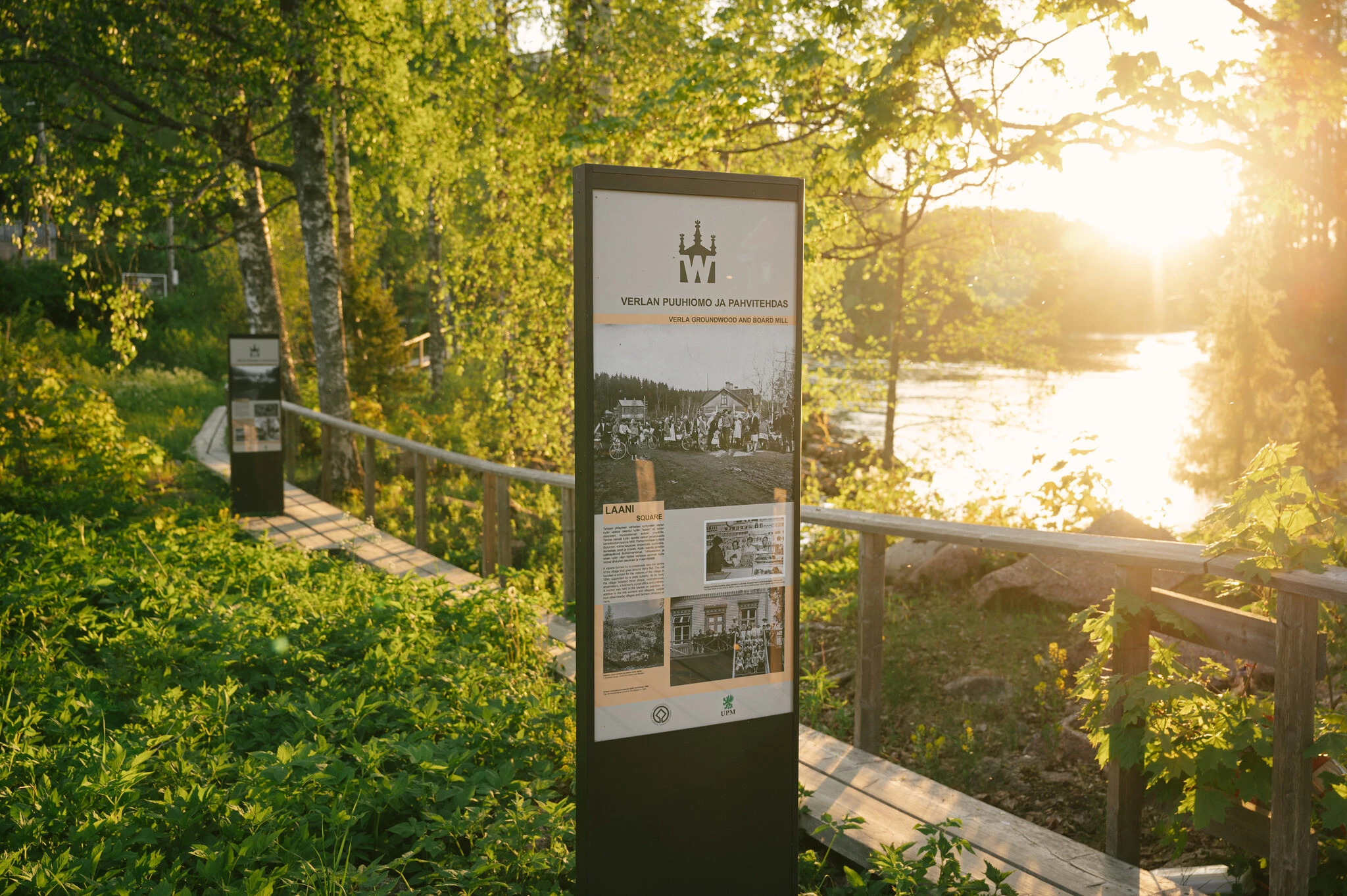 Vaikka historiapolun voi kiertää omatoimisesti, ryhmillä on mahdollisuus tilata polulle opastus museum.verla@upm.com